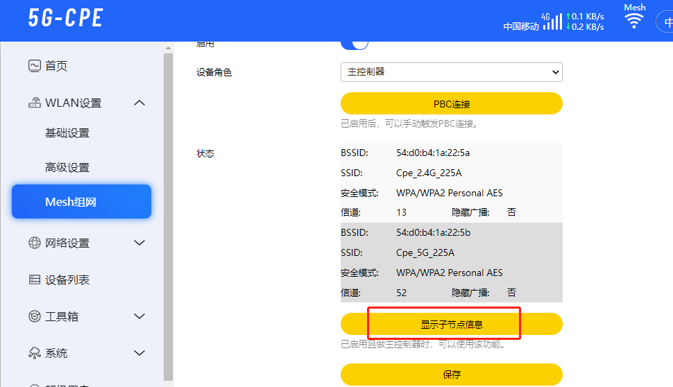分別登陸主控和子節(jié)點(diǎn)web頁(yè)面,點(diǎn)擊PBC連接,組網(wǎng)成功會(huì)提示:Mesh連接成功。
