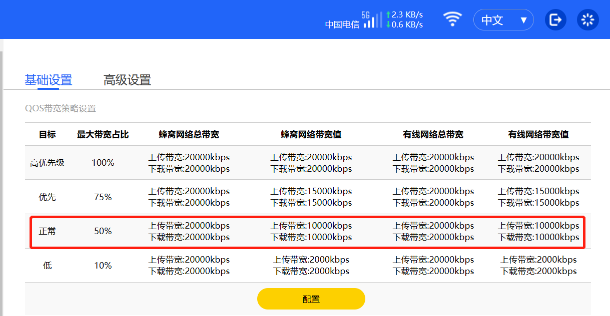 QOS功能可對(duì)移動(dòng)網(wǎng)絡(luò)和以太網(wǎng)帶寬進(jìn)行限制。啟用帶寬策略后,高級(jí)設(shè)置中未進(jìn)行設(shè)置,接入的終端設(shè)備默認(rèn)帶寬限制策略為正常。