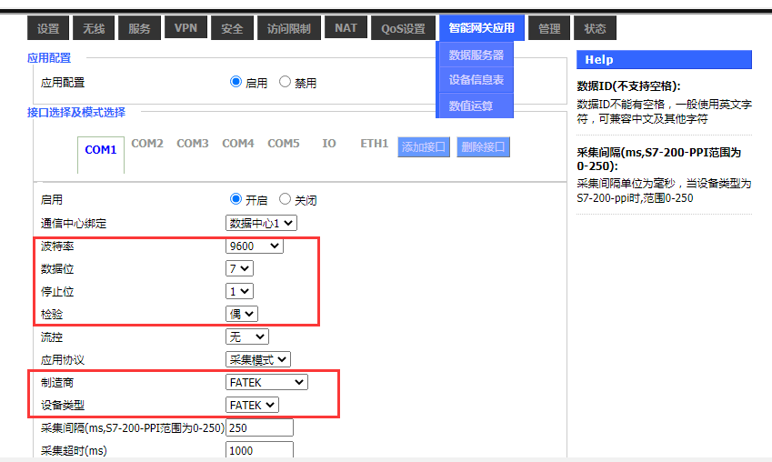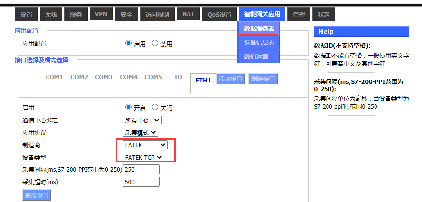 1、瀏覽器輸入四信網關的 LAN IP 進配置頁面,智能網關應用—設備信息表,應用配置 —啟用,ETH1—開啟,保存設置,選擇FATEK-TCP驅動,保存設置;