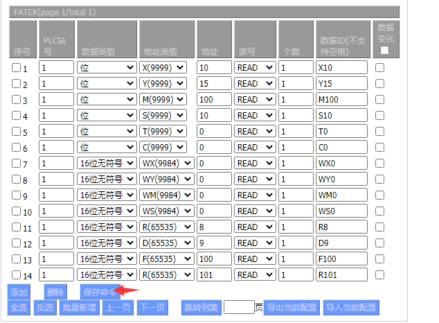 3、PLC 站號和 實際PLC站號保持一致,PLC站號為1,數據類型、地址類型、地址和實際點表保持一致,數據 ID 可自定義,配置后點擊保存命令;點擊保存設置——應用。