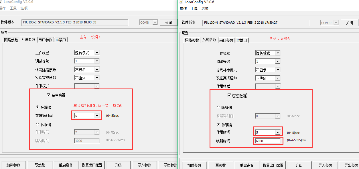 空中喚醒的喚醒端,需要配置“前導碼時間”,該數值需要與休眠端的休眠時間一致, 否則會造成無法通信的情況。